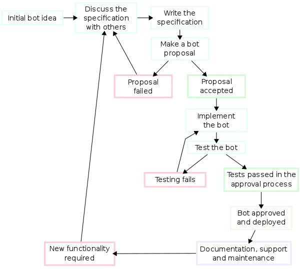 Writing a new bot requires significant programming ability. A completely new bot must undergo substantial testing before it will be approved for regular operation. Planning is crucial to obtain an error-free, efficient, and effective program. The following initial considerations are important: