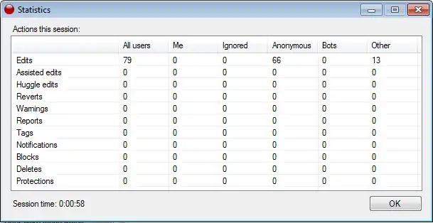 - Number of edits, assisted edits, Huggle edits, reverts, warnings, reports, tags, notifications, blocks, deletions, and protections