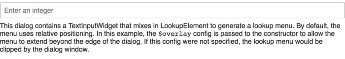 panel.$element.append( lookup.$element, '<p>This dialog contains a text input widget that ' +