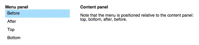 A MenuLayout combines a menu and a content panel. The menu is positioned relative to the content (after, before, top, or bottom) and its size is customized with the menuSize config. The content area will fill all remaining space.