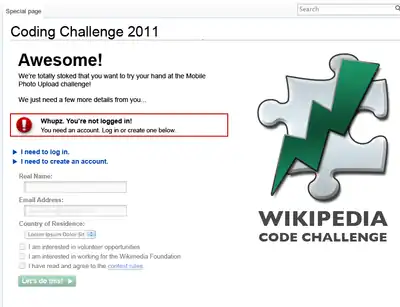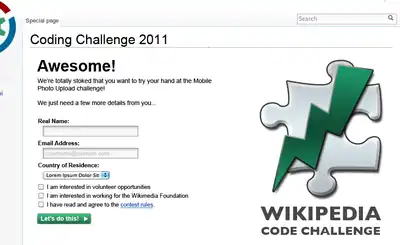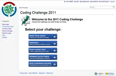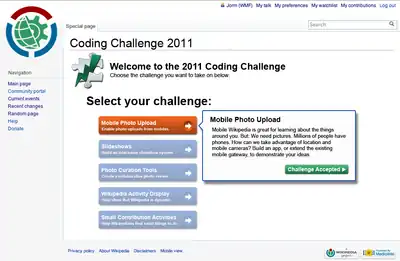 Several banner ads will be run on various projects announcing the Code Challenge. Clicking on any banner will bring the user to a special Landing Page hosted on MediaWiki.org. This process will work for all users, including anonymous IPs.