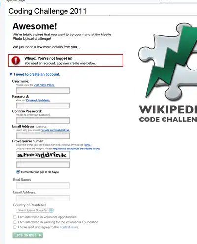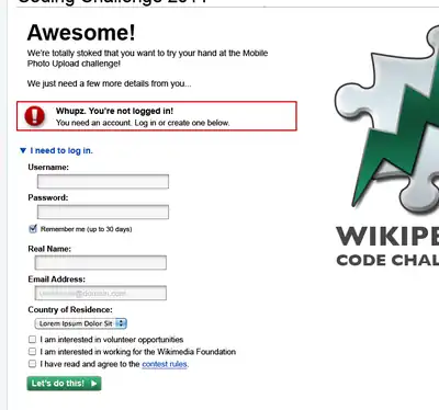 This project is envisioned as an extension that is deployed on MediaWiki.org in support of the Challenge. It is a multi-step interface that requires hooking overtop of the existing login and create account workflows.
