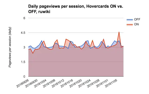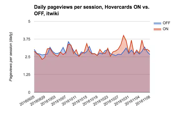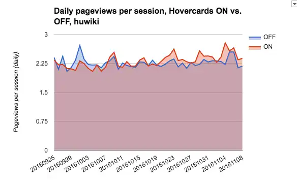- Changes in session depth - readers will only be opening the pages they are particularly interested in and viewing summaries on all other pages. Thus, we expect to see a decrease in pages viewed per browser session when Hovercards are turned on.