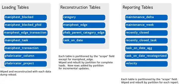 These tables hold a historical reconstruction of Phabricator data back to the beginning of available data; they represent a denormalization of the transaction data into an easier-to-query data set. They are partitioned by scope, so that a wipe of one scope does not affect any other scope. These tables are very time-consuming to create, and so are typically updated incrementally with each nightly dump.