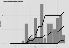 The Velocity forecast shows actual data as bars and forecast data as lines, based on one-week (Sunday to Sunday) snapshots. The lines represent a plausible range of values. The pessimistic forecast is the lowest three weeks of the previous three months; the optimistic forecast is the highest three; and the nominal forecast is the average of all weeks in the previous three months. (For teams using two-week Sprints or other processes in which most tasks are marked Resolved at a different cadence than weekly, this should produce weird-looking bars but accurate lines. Probably.)
