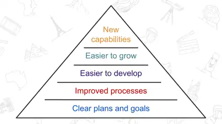 These goals can be written succinctly as: Clear plans and goals, improved processes, easier to develop, easier to grow, new capabilities.