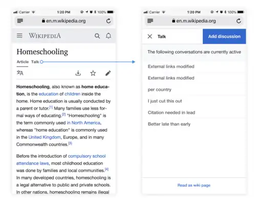 However this current Talk page experience is a little disconnected from the article it belongs to — particularly if you switch to "Read as wiki page". It can be a bit confusing to get back to the article. So one of our design goals is to unify the article and Talk experiences, by rendering the Talk page as a tab of the article, similar to desktop. We hope this will help people keep their context, while also allowing seamless navigation back and forth.