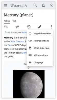 - Overflow menu - the overflow menu (accessed from the main actions on the top of the page) includes links to page information, wikidata description, permanent link, PDF downloads, and more)