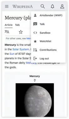 - User menu - the new user menu at the top of the page includes links to the user's user page, talk page, watchlist, contributions, and sandbox