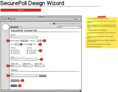The design of an poll will now be managed within a "wizard" (Special:SecurePollWizard). Upon initially going to Special:SecurePollWizard, the poll administrator will be presented with five elements: