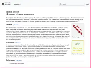 WikimediaApiPortal is a skin for MediaWiki created by the Wikimedia Foundation Platform Engineering Team in 2020 as part of the API Gateway initiative. The skin is designed to mimic the look and feel of conventional developer portals by incorporating header and sidebar navigation elements and following the Wikimedia Design Style Guide. The skin uses the Bootstrap CSS framework, OOUI library, and Mustache templates. The skin was created for use with the Wikimedia API Portal, so some elements of the design such as the site logo and footer are specific to Wikimedia.