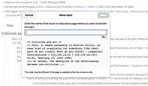 - Clicking "Move" at the top of a section will delete that section from the talk page, and paste it into the talk page that you specify in the modal.