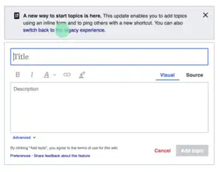 - Enhance the editing tool so people can write what they want to talk about without needing to learn or know about wikicode. An example: introducing a way for people to draft discussion topics using a rich text editor.