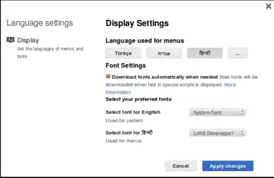 This settings module is for selecting the UI language and selecting the webfonts for language. It uses jquery.webfonts for working with webfonts and uses ULS preferences system(see below) for persisting the preferences.