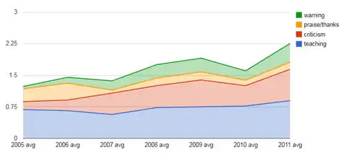 On the other hand, editing Wikipedia has tended to become harder over time, and the likelihood that new users will receive correction/criticism has increased. This is reflected by various efforts to code and analyze the experience of new users, such as the recent Newbie teaching strategy research sprint undertaken within the scope of our Summer of Research.
