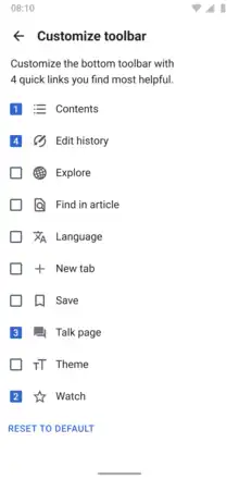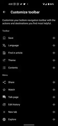What was very evident in our research was the flexibility needed so that our users unique needs are met when they are reading an article and prefer not to see editing tools compared to when they may want to edit and have a desire for specific editing tools or talk pages. With the requests for flexibility in mind, the team will release and test a customizable toolbar, which will allow users to choose which quick actions appear in the bottom bar in article view versus which things should go to the overflow menu and reading focus mode, a feature that hides the bottom quick actions toolbar on scroll as well as the edit pencils and call to actions. Reading mode will be off by default but accessible via Themes. The team will ensure users are able to recall how to turn read mode off so that we don't impede anyone's ability to edit.