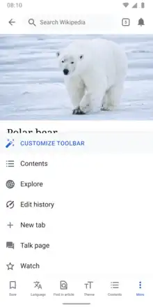 - Talk pages: Article talk pages and User talk pages are now presented natively. When reading an article, the corresponding talk page is accessible by scrolling to the bottom and selecting "View talk page". User talk pages can be accessed from various places where user interactions might happen, including your watchlist, various push notifications (e.g. messages left by other users on your talk page), and other users' and article talk pages.