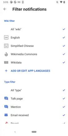 Users are now able to filter notifications by Wiki and notification type in the home center T294035, while also accessing settings to update preferred language settings in the filter view.