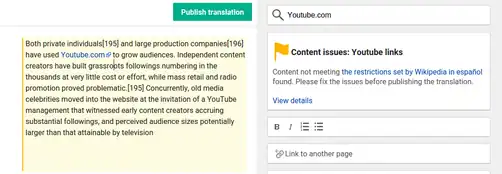 - Translation sections are validated against the abusefilter rules in target wiki as the user edits it. This is based on the high number of publishing failures since abusefilter at target wiki blocks it. This will allow translators to make the edits valid before publishing