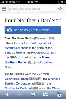 Mobile web UI showing upload button in a Wikipedia page without images.