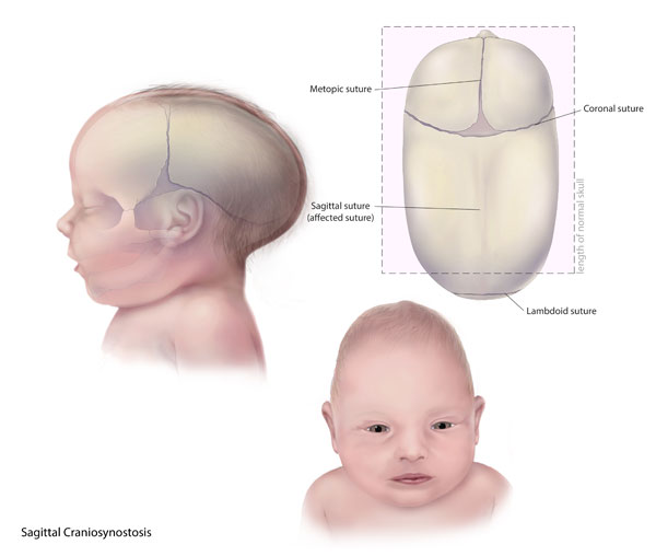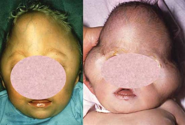 Craniosynostosis prevents the skull from growing normally, frequently giving the head a pointed appearance (acrocephaly). In severely affected individuals, the abnormal fusion of the skull bones results in a deformity called a cloverleaf skull. Craniosynostosis can cause differences between the two sides of the head and face (craniofacial asymmetry). Early fusion of the skull bones can affect the development of the brain and lead to increased pressure within the skull (intracranial pressure). Premature fusion of the skull bones can cause several characteristic facial features in people with Carpenter syndrome. Distinctive facial features may include a flat nasal bridge, outside corners of the eyes that point downward (down-slanting palpebral fissures), low-set and abnormally shaped ears, underdeveloped upper and lower jaws, and abnormal eye shape. Some affected individuals also have dental abnormalities including small primary (baby) teeth. Vision problems also frequently occur.
