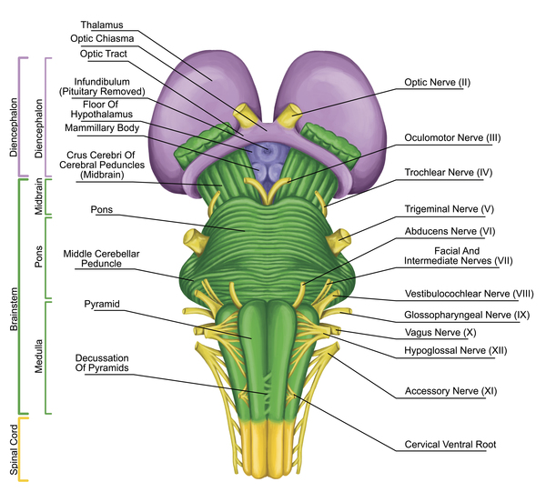 Many of the signs and symptoms of Moebius syndrome result from the absence or underdevelopment of cranial nerves VI and VII. These nerves, which emerge from the brainstem at the back of the brain, control back-and-forth eye movement and facial expressions. The disorder can also affect other cranial nerves that are important for speech, chewing, and swallowing. Abnormal development of cranial nerves leads to the facial muscle weakness or paralysis that is characteristic of Moebius syndrome.