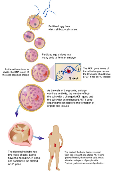 Proteus syndrome results from a mutation in the AKT1 gene. This genetic change is not inherited from a parent; it arises randomly in one cell during the early stages of development before birth. As cells continue to grow and divide, some cells will have the mutation and other cells will not. This mixture of cells with and without a genetic mutation is known as mosaicism.