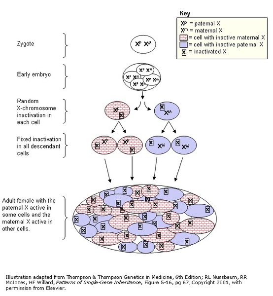 In females, who have two copies of the X chromosome, one altered copy of the PDHA1 gene in each cell can lead to less severe features of the condition or may cause no signs or symptoms at all. However, many females with one altered copy of this gene have pyruvate dehydrogenase deficiency similar to affected males because the X chromosome with the normal copy of the PDHA1 gene is turned off through a process called X-inactivation. Early in embryonic development in females, one of the two X chromosomes is permanently inactivated in somatic cells (cells other than egg and sperm cells). X-inactivation ensures that females, like males, have only one active copy of the X chromosome in each body cell. Usually X-inactivation occurs randomly, such that each X chromosome is active in about half of the body cells. Sometimes X-inactivation is not random, and one X chromosome is active in more than half of cells. When X-inactivation does not occur randomly, it is called skewed X-inactivation.