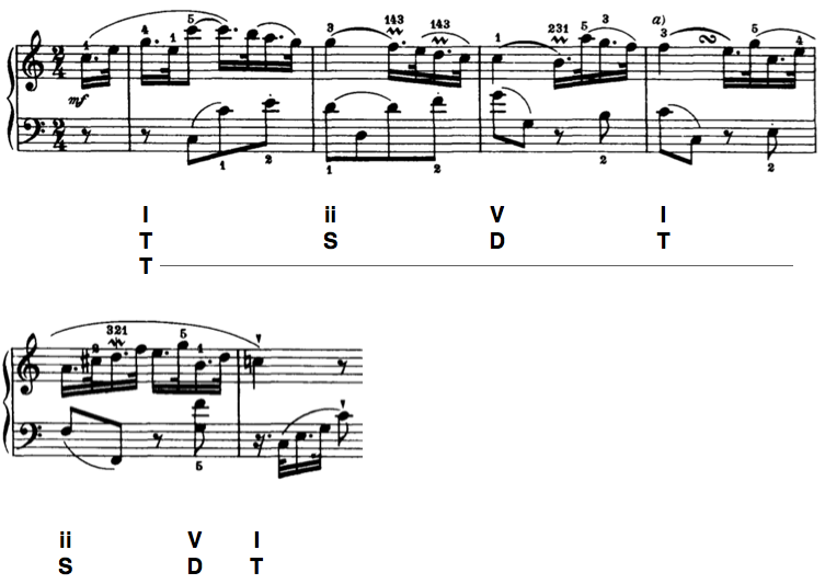 - progress toward an authentic cadence (ending with V(7) I, D5 T1 in functional bass)