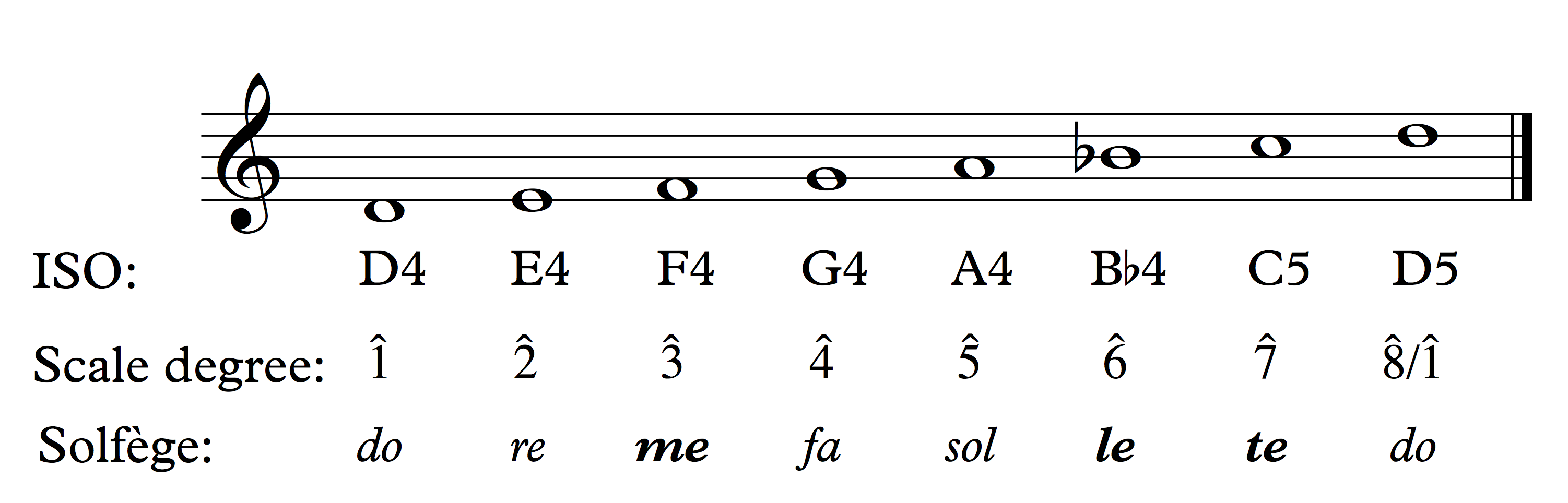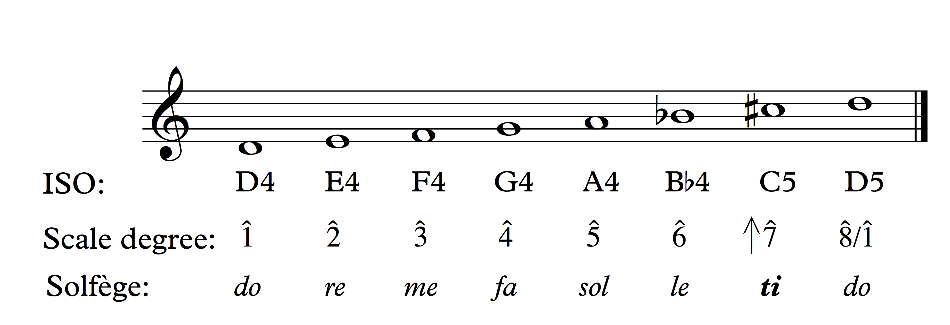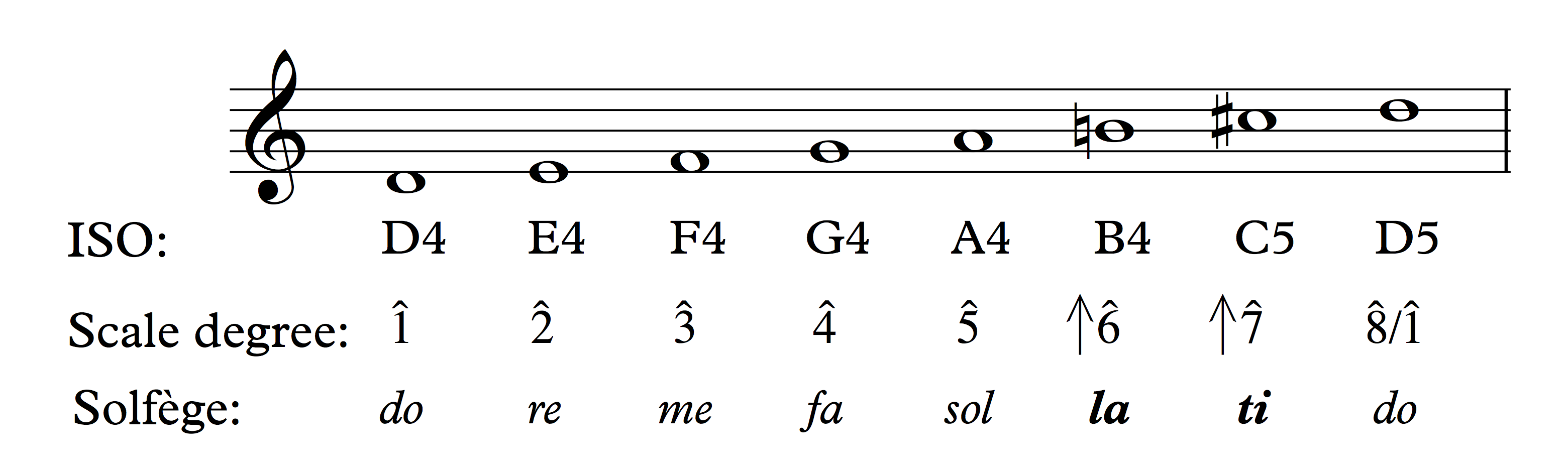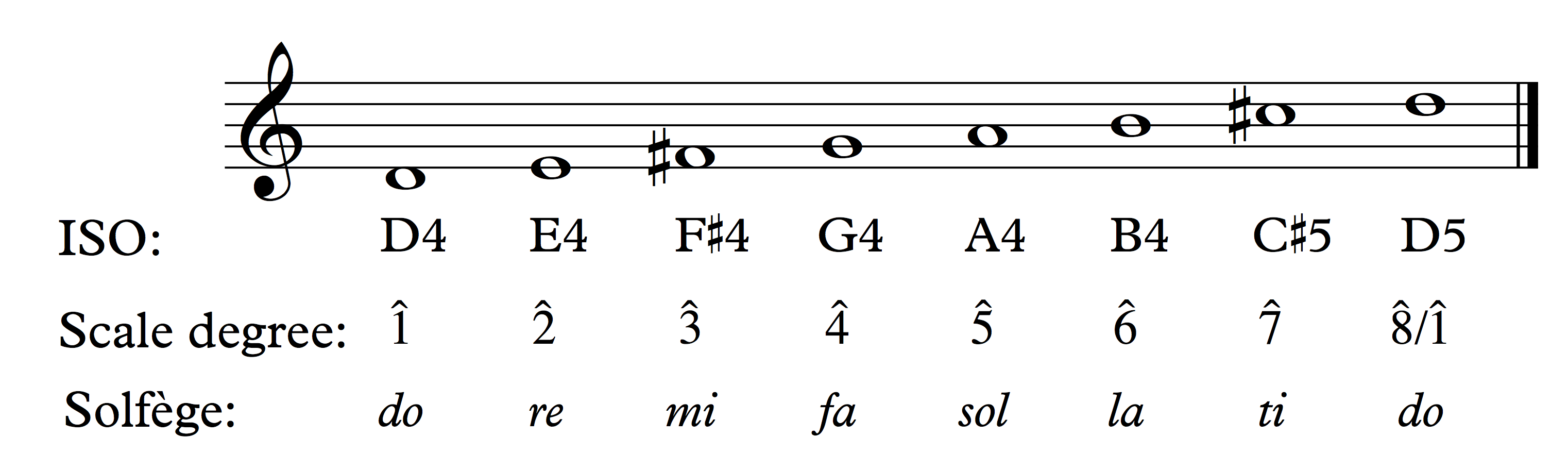 Scale degrees are labeled with Arabic numerals and carets (^). The illustration below shows a D-major scale and corresponding ISO notation, scale degrees, and solfège syllables.