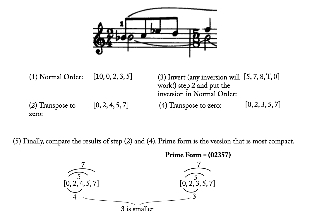 All pitch-class sets that are transpositionally and inversionally related belong to the same set class, and they are represented by the same prime form. We follow a simple process to put a pitch-class set in prime form: