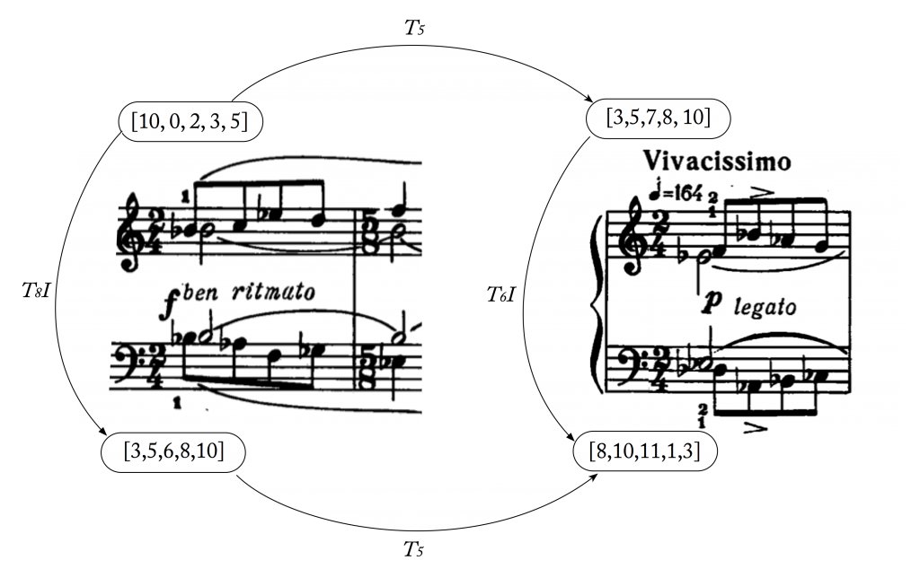 We’ve already seen sets of pitch-classes, though we haven’t really been calling them that. When we extract a group of notes from a passage of music and put them in normal order, that group of notes is a pitch-class set. As we’ve seen in class, one very interesting way of looking at a lot of post-tonal music is by studying the transpositional and inversional relationships between pitch-class sets. In the short example below (from Bartók’s “Subject and Reflection”) you’ll notice that the right hand of the two passages is T5-related, as is the left-hand. Within each passage, the right and left hands are T8I _and _T6I related, respectively.