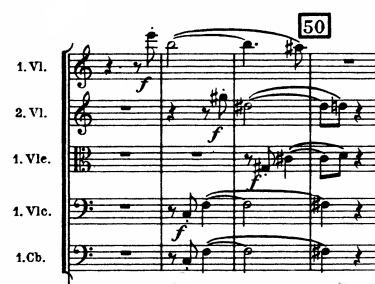 Pitch-class symmetry is very similar to pitch symmetry, but understood in pitch-class space. Below you’ll see another passage from the same piece by Bartók. As above the lower strings have an ascending gesture that mirrors the descending gesture in the upper strings.