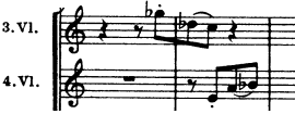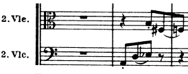 Pitch symmetry always implies an axis of symmetry. Maintaining our mirror metaphor, this is the place in pitch space where the mirror exists. In the case of the example above, the mirror is located at B4. Below, you’ll see the same gesture in the lower strings. The pitch-space line shows that it has a different axis of symmetry — around E2.