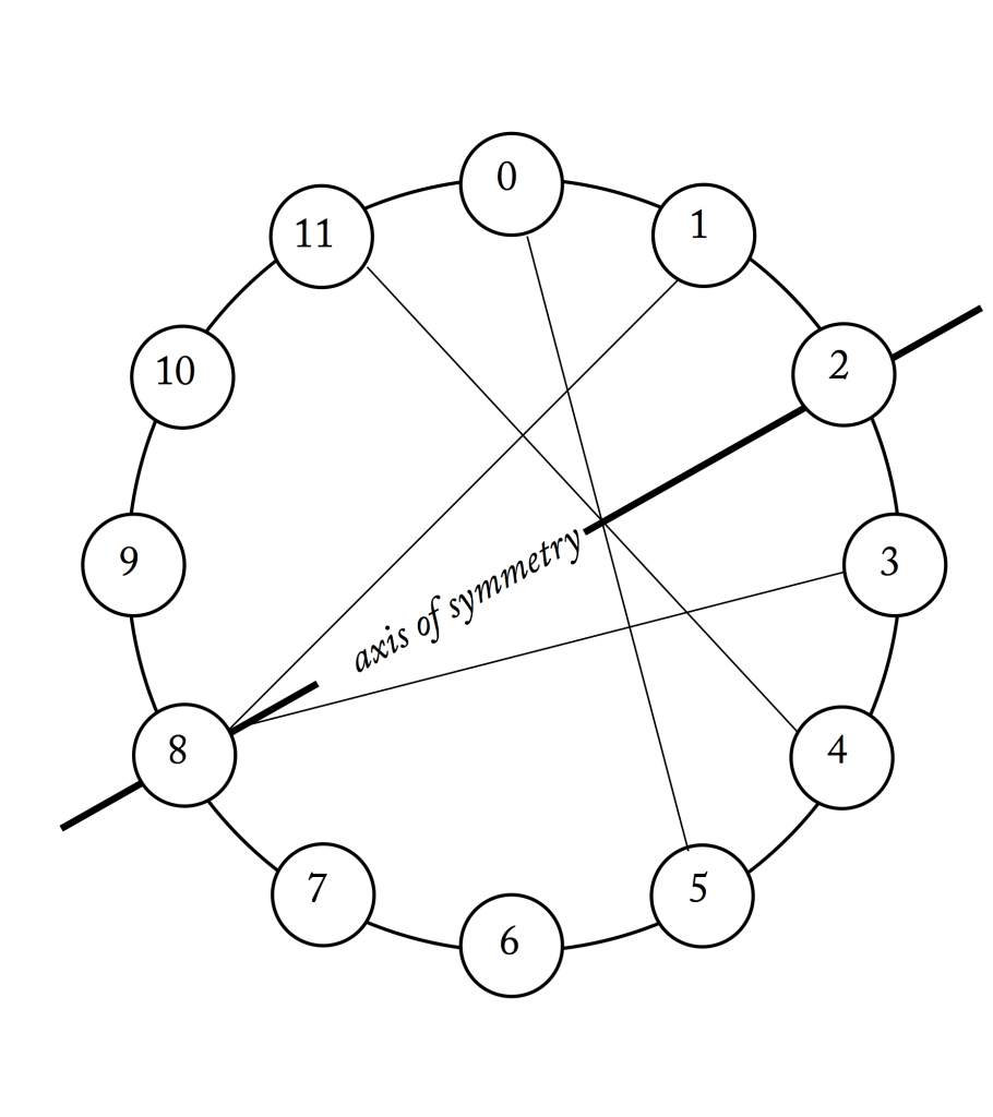 Mapping this on the pitch-class circle shows the passage’s pitch-class symmetry. Look at this circular diagram very carefully. You’ll notice that the passage is pitch-class symmetrical around both 2 and 8. Unlike pitch space, pitch-class axes are always located at two different points in the pitch-class circle.