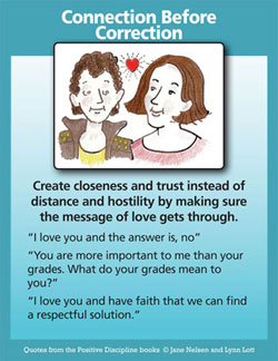 When children feel a connection, they feel belonging and significance. Often that is enough for misbehavior to stop. As you learn about the many Positive Discipline tools, notice that they are all designed to create a connection before respectful correction.