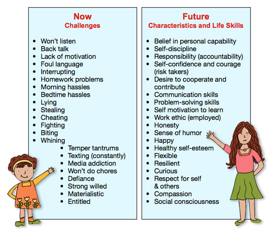 Following is a list of behavior challenges (Now) and life skills and characteristics (Future) brainstormed by parents in many classes. They are always very similar. How many of these challenges and goals were on your list? Are there some you would like to add to your list?