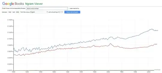 In the Ngram above, "about" is one and a half times more frequent than "over" and more than a hundred times more frequent than "envelope."