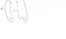 Notice that the hydrogen atoms in the ethene compound are directly upwards or downwards. Also, we write a large n to show that we mean many (but an unspecified quantity of many). These form a long chain, which has bonds attaching either side, showing this.The polymer has exactly the same number of atoms as all of the monomers since that is the only product produced. So ethene monomers would make poly(ethene). For larger alkenes we cheat and write the same structure of ethene with an extra compound added on. For example with propene:
