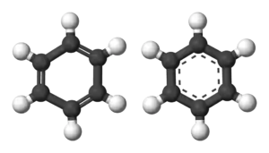 Benzene is an aromatic hydrocarbon. Instead of having three short double bonds and three long single bonds (above, left), it has six medium-length bonds (above, right).
