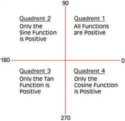 ![]() The Cast Model is used to show in which quadrant a trigonometric ratio will be positive. A mnemonic is All Students Take Core 4. The four indicates that Cosine is in the fourth quadrant. Also you need to know that sin(x) = sin(π rad or 180° - x) = c, cos(x) = cos(2π rad or 360° - x) = c, and tan(x) = tan(π rad or 180° + x)= c. This is important to remember because if sin(x) = 1/2, and it is between 0° and 360° then x can be 30° or 150°. |
