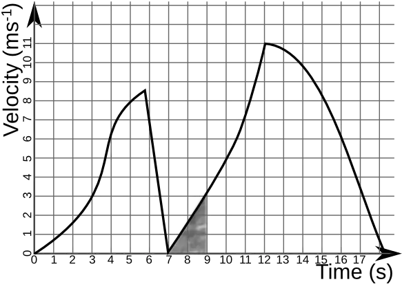 3. In the following velocity-time graph, how far does the object travel between 7 and 9 seconds?