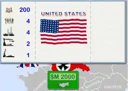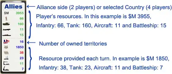 • Resource provided to player by Country. In example is $M 200, 4 Infantry, 4 Tanks, 2 Aircraft and 1 Battleship each turn.