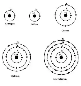 Fig. 1.2: Simplified representation of the electron shells in hydrogen (H), helium (He), carbon (C), calcium (Ca) and molybdenum (Mo) atoms.