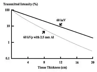 Fig. 1.16: Attenuation in tissue for 60 keV monoenergetic photons and for a 60 kVp polychromatic X-ray beam filtered by 2.5 mm of aluminium.