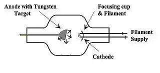 An electric current can be passed through a small filament inside a vacuum tube to produce electrons. These are formed into an electron cloud and accelerated across the tube to hit a tungsten anode. The acceleration can be provided by hooking the anode and cathode up to a high voltage supply, which can typically generate voltages in the region of 20 to 150 kV. X-rays are then produced within the tungsten target, as indicated by the short arrows in the figure.