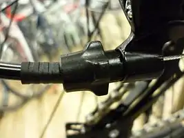 ![]() A brake barrel adjuster. The large ring is a lock for the smaller one, the adjuster. Notice the crimped ferrule where the housing makes a loose entry. | ![]() This kind of adjuster is found on some rear derailleurs. It can exist in addition to one on the shifter. | ![]() A cable stop welded to the frame. A silver housing with a ferrule fits at the bottom and the internal steel cable continues at the top. | ![]() Note the black barrel adjuster on the gear shifter and the silver one on the brake lever. |