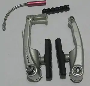 - Noodles/Transitions: Brakes arms are connected to the cable housing at the cable bridge, where a nipple on a noodle locks onto it. This fitting has a sweeping curve that allows the incoming cable direction to be changed without kinking the cable or its housing. It is either a solid noodle or is sprung. Cable housings are tightly pressed into these noodles so must be selected with the correct diameter. They are often supplied at purchase with a rubber boot, a flexible rubber piece to protect the exposed cable at the brake arm assembly.