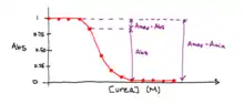 An absorption curve for myoglobin exposed to varying amounts of denaturant, e.g., urea or guanidinium chloride. The absorption decreases due to exposure of the heme to solvent.
