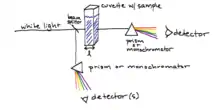 A basic spectrometer design. Prisms are shown, however, it is more common to use diffraction gratings.